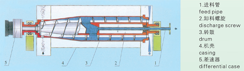 電機(jī)帶動(dòng)無孔轉(zhuǎn)鼓及同心安裝的輸料螺旋,以一定的差速同向高速旋轉(zhuǎn)。物料由進(jìn)料管連續(xù)引入輸料螺旋內(nèi)筒,加速后進(jìn)入轉(zhuǎn)鼓,在離心力作用下,較重的固相物沉積在轉(zhuǎn)鼓壁上形成沉渣層。輸料螺旋將沉積的固相物連續(xù)不斷地推至轉(zhuǎn)鼓錐端,經(jīng)排渣口排出轉(zhuǎn)鼓及機(jī)外。較輕的液相物則形成內(nèi)層液環(huán),由轉(zhuǎn)鼓大端溢流口連續(xù)溢出轉(zhuǎn)鼓,經(jīng)排液口排出機(jī)外。