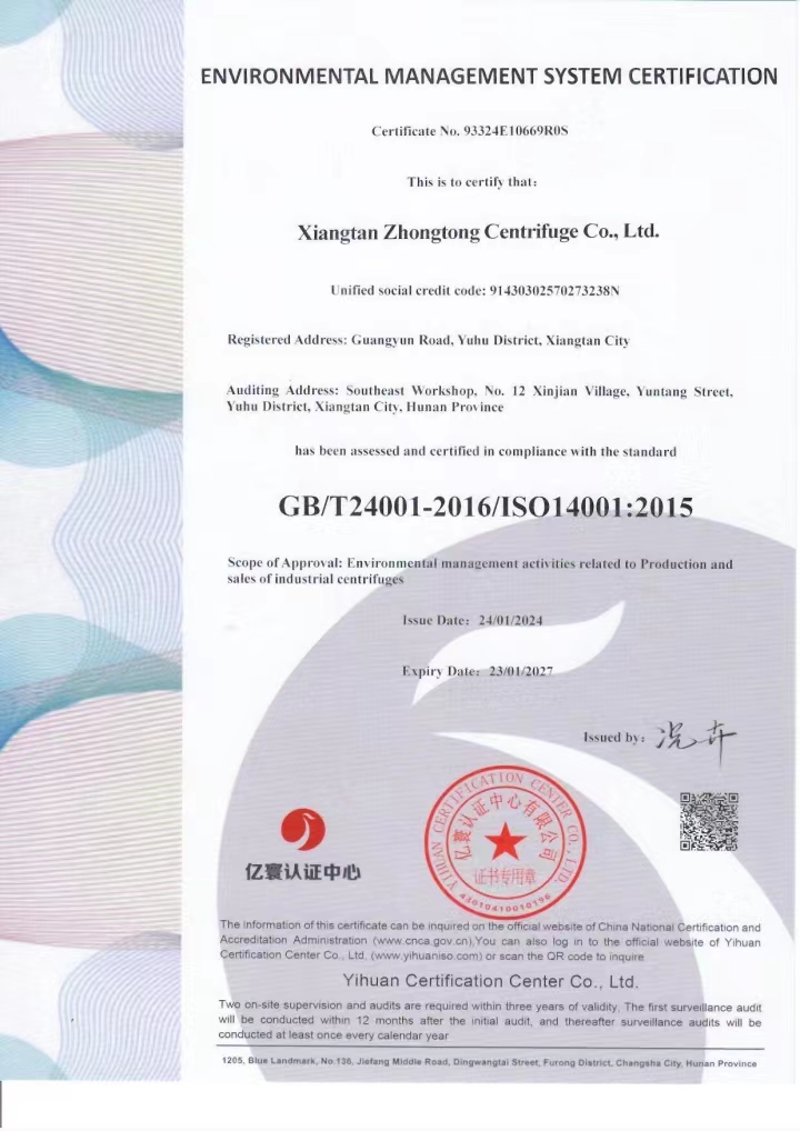 湘潭眾通離心機(jī)環(huán)境管理體系認(rèn)證證書
